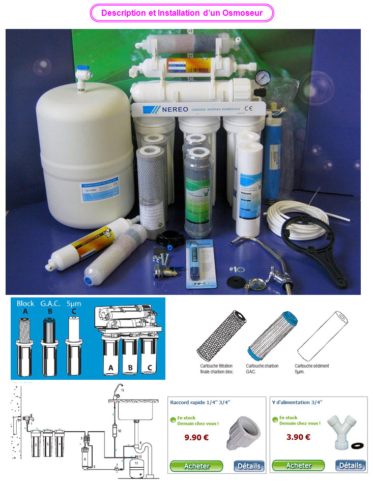 Concernant l’achat des osmoseurs et des différentes variantes, je vous donne rendez-vous sur cette autre page qui devrait être remise à jour plus régulièrement car, comme vous le savez, concurrence oblige, ça change tout le temps et pas forcément en mieux. En vérité, pour le même prix, vous en aurez moins compte tenu de l’inflation (non déclarée par le gouvernement).